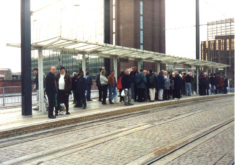 Members of the Light Rail Transit Association waitimg at East Croydon for the first chartered tram tour of the new system