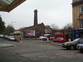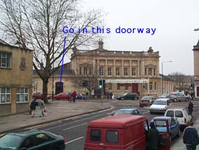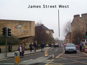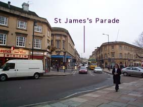 turn left at the Bath City Church (previously the 'Forum' cinema) and walk up St James's Parade (Note the old tramway