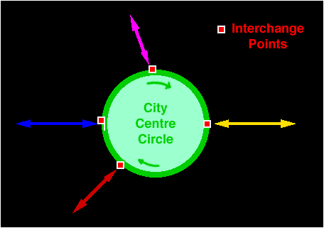 Any journey other than directly along one radial will involve at least one, sometimes two, changes of vehicle. This is a most unsatisfactory arrangement and has been rejected. |