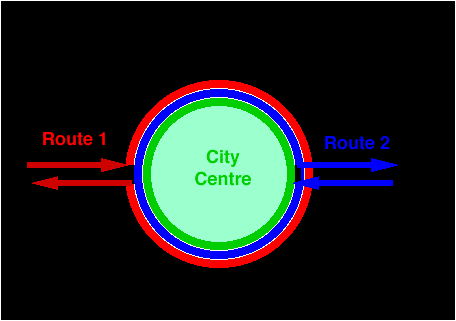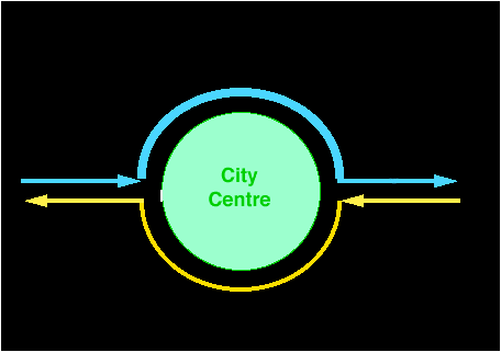 b) Operate services right across the city using one half of the circle for the journey in one direction and the other half for the return journey.