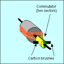 The current can be picked up by carbon brushes rubbing on a commutator, which is a drum made of copper bars (insulated from each other). Each brush is connected first to one end of the coil, then to the other, as the rotor revolves |