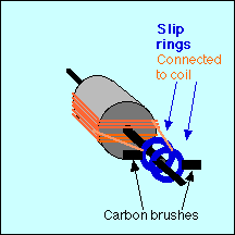 The current can be picked up by carbon brushes rubbing on a set of copper slip-rings. Each brush is continuously connected to the same end of the coil |