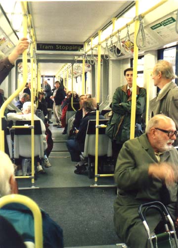 The tram has seats for 70 but there is still plenty of room to move around The smooth ride allows large numbers of extra standing passengers in safety There are reserved spaces for pushchairs and wheelchairs