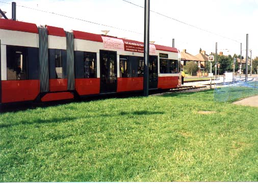 A Trams run safely alongside a grassed open space without any need for a barrier