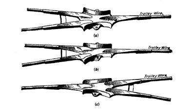 At points where one track bifurcated or two tracks joined, the overhead wire was similarly dealt with by means of a 'frog'.