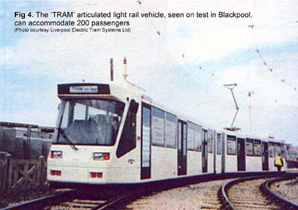 The 'TRAM' articulated light rail vehicle, seen on test in Blackpool, can accommodate 200 passengers. (Photo courtesy Liverpool Electric Tram Systems Ltd).