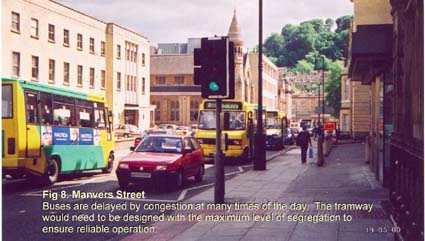 Manvers Street - buses are delayed by congestion at many times of the day. The tramway would need to be designed with the maximum level of segregation to ensure reliable operation.