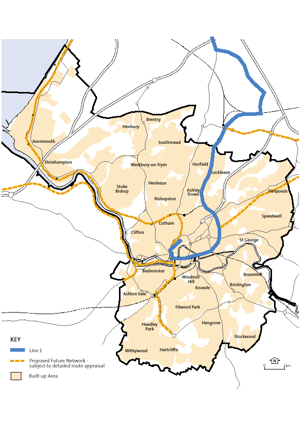 78. Exhaustive testing of appropriate technologies, routes and the phased introduction of a wider network has resulted in the decision to promote a light rail route between Almondsbury and the City Centre as Line 1 (see Figure 5.6)