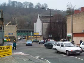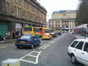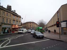 turn left at the Bath City Church (previously the 'Forum' cinema) and walk up St James's Parade (Note the old tramway