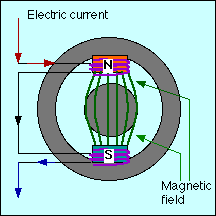 The magnetism which causes the dynamo to generate electrical power is created by electric current flowing through the windings on the pole pieces. This current is far smaller than the output current of the dynamo. The output voltage of the dynamo depends on the speed of rotation and the strength of the magnetic field. By increasing or decreasing this magnetising current, the output voltage of the dynamo can be increased or decreased, even though it is stll rotating at the same speed |