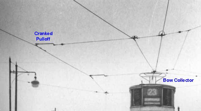 The bow collector, with a wide carbon rubbing strip, was much less critical of the positioning of the contact wire. This could be used to advantage by setting up the wire around curves in longer straight sections, requiring less overhead hardware. The disadvantge was that the support wires had to be kept well clear of the width of the bow and larger 'cranked' pulloff insulators were necessary in certain places.