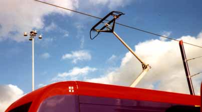 To make electrical contact with the overhead wire, the tramcar is fitted with a current collecting device. In the earliest experiments, this was in the form of a small wheeled trolley which ran on the top of a pair of wires, towed along by the tramcar and feeding current to it through a cable. The tram which obtained its power in this way was known as a 'Trolley Car', later abbreviated to 'Trolley' and used in the U.S.A. as the general term for any type of railed street-running vehicle.