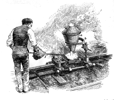 Key: a Crucible containing 'thermit' reaction b Crucible support c Clamp holding rail ends in alignment d Tapping rod to release molten metal flow into mould |