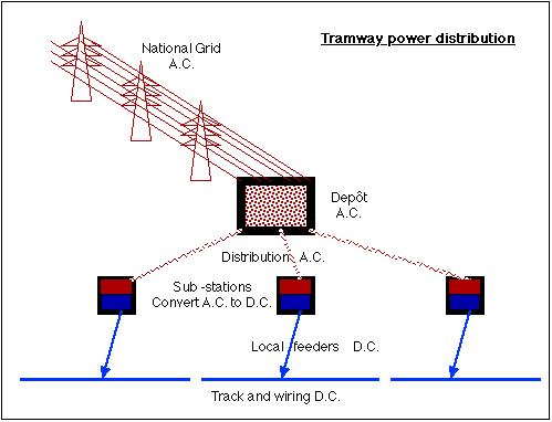 The electrical power for a tramway is usually taken from the national grid at too high a voltage to be safely used in the streets and is Alternating Current (A.C.). This does not suit most tramcars which operate on Direct Current (D.C.).
