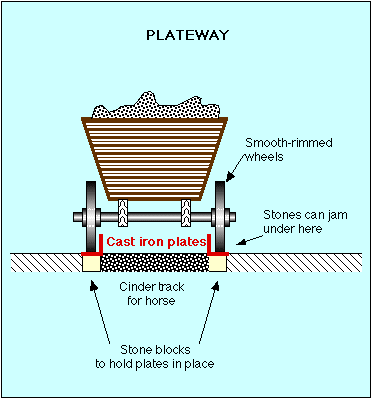 The very earliest tramways had ordinary waggon wheels on the vehicles and guidance flanges on the rails. This 'plateway' system allowed the vehicles, usually coal or mineral tubs, to be manoevered and run away from the rails on ordinary flat road surfaces. The system allowed some degree of tolearance in the positioning of the plates - and cross ties would have tripped-up the horses - so stone blocks were set in the ground to hold the plates in place . (An oak peg was driven into holes in the blocks and each end of the plate was nailed down to a peg.) |