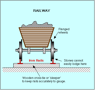had to be provided on the vehicle wheels instead. A certain amount of clearance had to be allowed between the flanges and the rails, so that any slight misalignment did not cause the flanges to 'bind-up' tight, but if there were too much clearance, the wheel could slip down between the rails. The rails needed to be held accurately to an agreed width, the 'gauge' of the track, and cross-ties were installed to hold it in place. (If horses were used as the motive power, the gaps between the sleepers had to be built up level with the sleeper tops to provide a smooth pathway for the horse) |