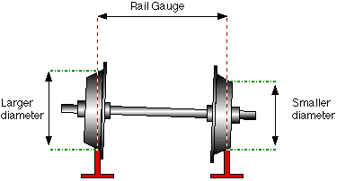 Obviously the wheels cannot be made to change size in order to steer the vehicle, but it is possible to make different parts of the same wheel differ in diameter by machining the tread to a cone shape. When the wheel comes to a curve in the track it will tend to go straight on, throwing the wheels towards the outside of the rails. If the wheels are correctly coned, the one at the outside of the curve will find itself running on a larger diameter and the one on the inside will be on a smaller diameter, this will then steer the vehicle around the curve |