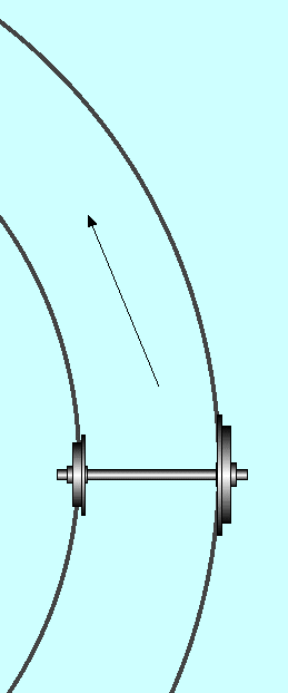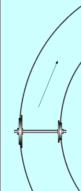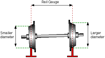 Obviously the wheels cannot be made to change size in order to steer the vehicle, but it is possible to make different parts of the same wheel differ in diameter by machining the tread to a cone shape. When the wheel comes to a curve in the track it will tend to go straight on, throwing the wheels towards the outside of the rails. If the wheels are correctly coned, the one at the outside of the curve will find itself running on a larger diameter and the one on the inside will be on a smaller diameter, this will then steer the vehicle around the curve |